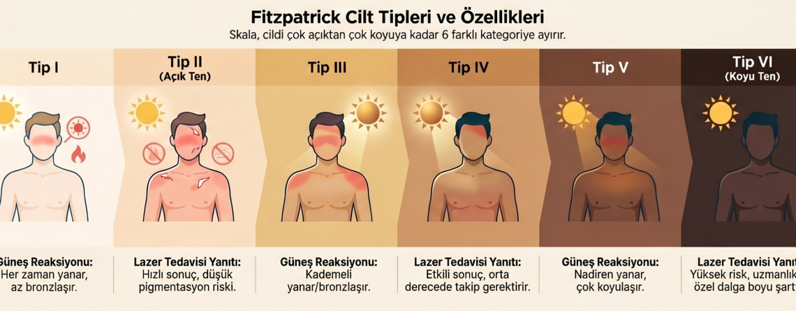 Dövme sildirme işleminde cilt rengi ve tipi, hem tedavinin ne kadar güvenli geçeceğini hem de toplamda kaç seans süreceğini belirleyen en kritik faktörlerden biridir. Uzmanlar bu süreci planlarken cildi, güneş ışığına verdiği tepkiye göre sınıflandıran Fitzpatrick Skalası‘nı (Tip 1’den Tip 6’ya kadar) temel alırlar.