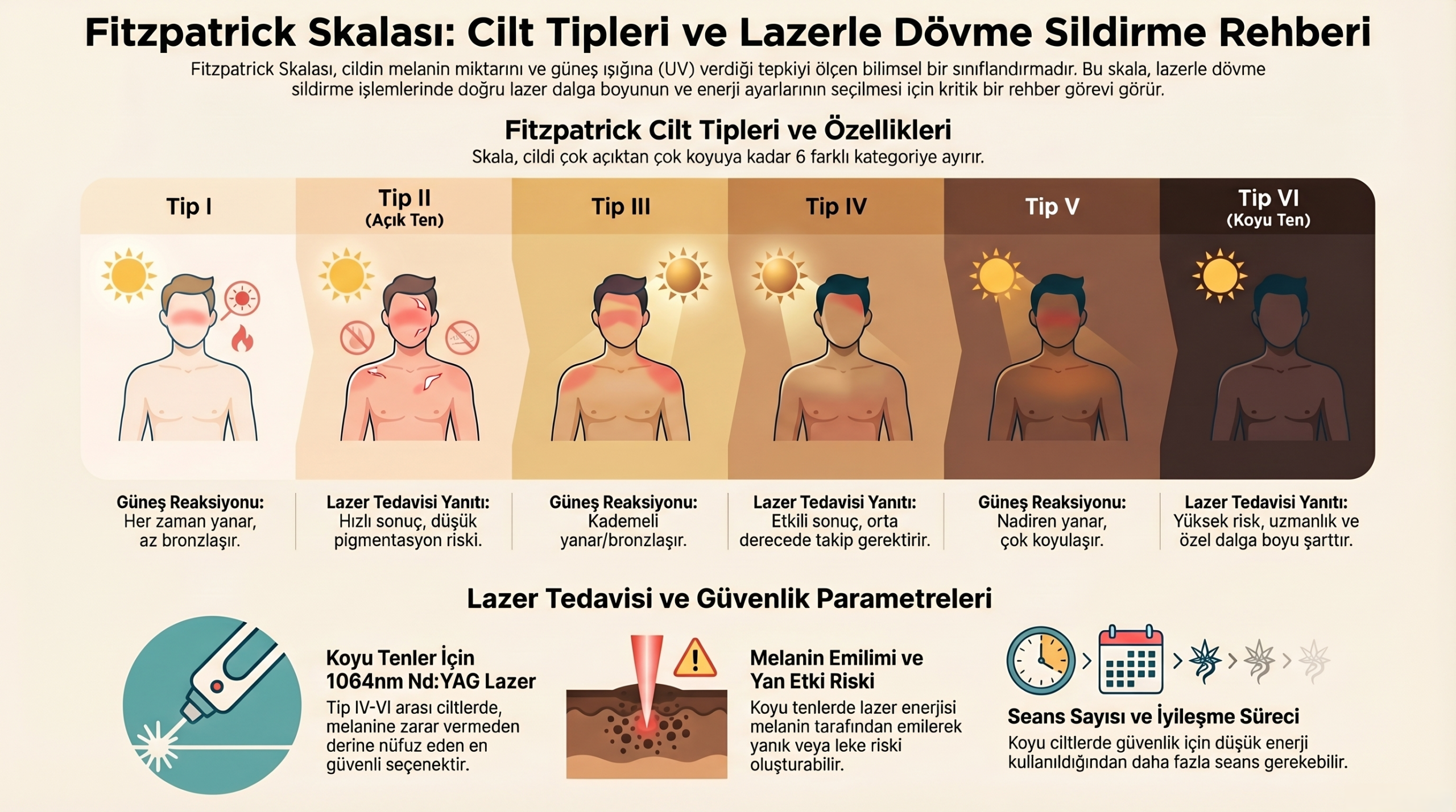 Özetle; açık tenli kişilerde süreç daha hızlı ve düşük riskli ilerlerken, koyu tenli kişilerde cildi korumak adına daha düşük enerjili ve daha fazla seans içeren sabırlı bir yaklaşım gerekir.